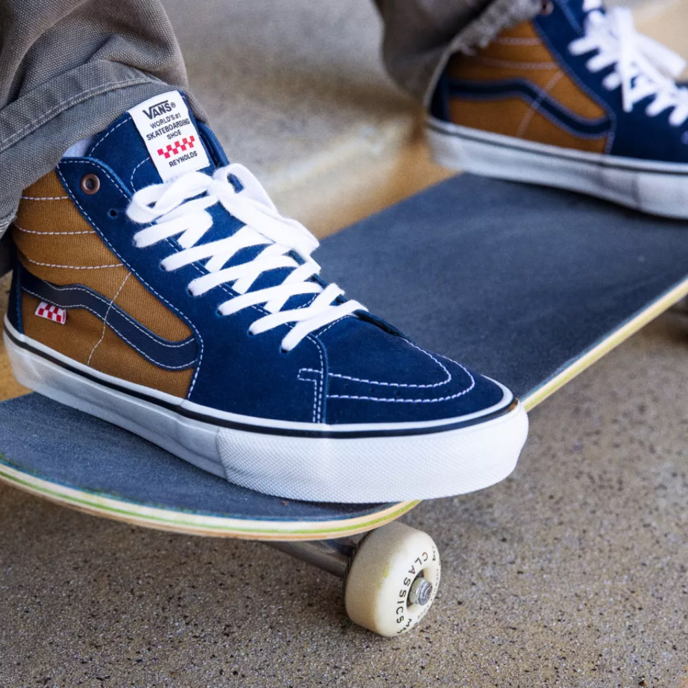 The new Reynolds Skate Sk8-Hi’s updated foxing tape, along with a mix of sturdy suede, denim, and heavy canvas uppers inspired by classic 90s skateboarding, gives you the iconic look you want while bringing all the performance benefits skateboarders demand. The new checkerboard flag on the side guarantees that you’re getting the best in style and modern skateboarding performance, and Andrew also had the idea to flip the tongue label and highlight the underlying message of Skate Classics: Vans—World’s #1 Skateboarding Shoe.