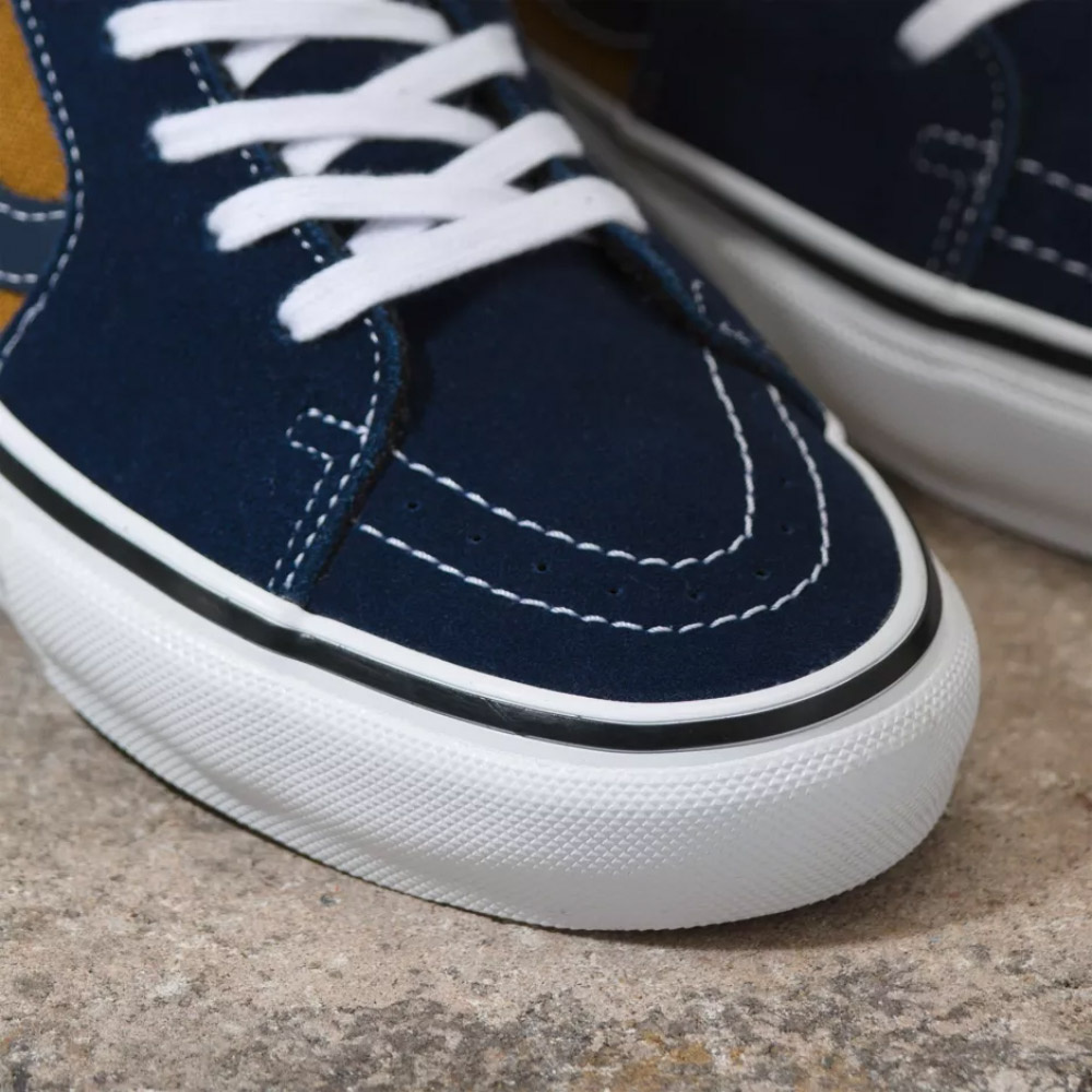 Completely redesigned for modern skateboarding, the all-new Reynolds Skate Sk8-Hi delivers more of what skateboarders need to enable maximum progression. The repositioned DURACAP™ reinforced underlays and fully redesigned uppers, combined with a new two-part foxing tape that features a deeper knurl pattern on the toe, make the new Reynolds Skate Sk8-Hi durable enough to withstand daily skateboarding abuse. For more board control, the new molded heel counter and internal tongue straps lock in your feet. Even the gum rubber sole that made Vans famous has been elevated with the SICKSTICK™ rubber compound to deliver more grip and boardfeel. Plus, POPCUSH™ energy return sockliners provide superior cushioning and impact protection while helping to lessen leg fatigue for longer skate sessions. Internal heel stiffeners have also been added to provide more support and stability.