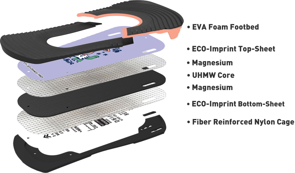 - Eva Footbed cała wkładka pod butem jest wyłożona warstwą materiału tłumiącego Eva, który zarazem błyskawicznie przekazuje polecenia obciążenia krawędzi.