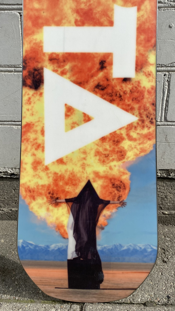 Deska testowa. Laminat jest w dobrym stanie, z widocznymi śladami użytkowania w postaci rys oraz śladów po wiązaniach. W jednym miejscu znajduje się zadzior na ściance bocznej (widoczny na zdjęciu). Ślizg jest w stanie bardzo dobrym - posiada jedynie niewielkie rysy. Deska po zakupie wymaga serwisu. Produkt objęty jest standardową gwarancją producenta.